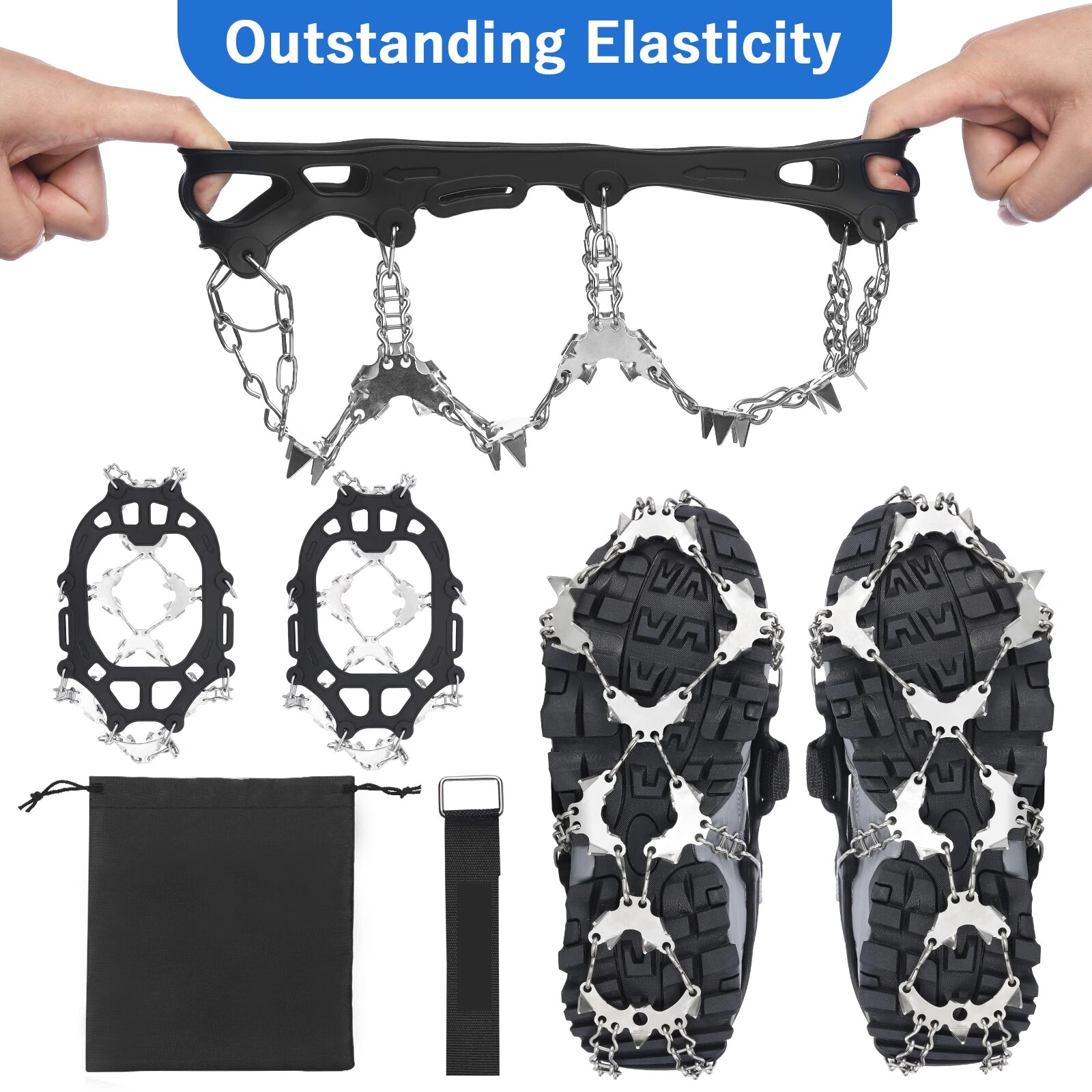 Garras de hielo con 32 púas de acero inoxidable, ideales para caminar sobre superficies nevadas o heladas. Fabricadas con silicona resistente y flexible, brindan tracción superior, durabilidad y comodidad incluso en climas extremos. Su diseño multidireccional distribuye el peso de manera uniforme y mejora la estabilidad. Incluyen correas de velcro para un ajuste seguro y bolsa de almacenamiento para fácil transporte. Disponibles en tallas M, L y XL. Perfectas para actividades al aire libre en invierno.