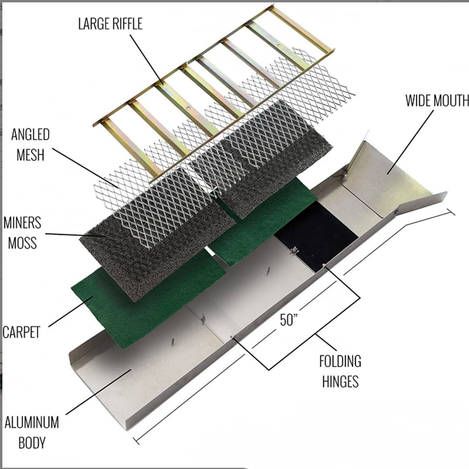 Caja plegable para busqueda de oro portátil, ideal para instalación en ríos y arroyos. Fabricada en aleación de aluminio resistente a la oxidación y la erosión, garantiza durabilidad en entornos complejos. Diseño ligero y plegable permite transporte fácil y almacenamiento simple. El diseño generan flujo turbulento que atrapa polvo y piezas de oro eficiente. Seguro y práctico, se bloquea firmemente en el agua durante su uso. Tamaño: 40 × 15 × 26 cm. Incluye 1 caja de hendidura dorada. Vamos por el oro