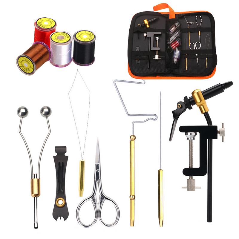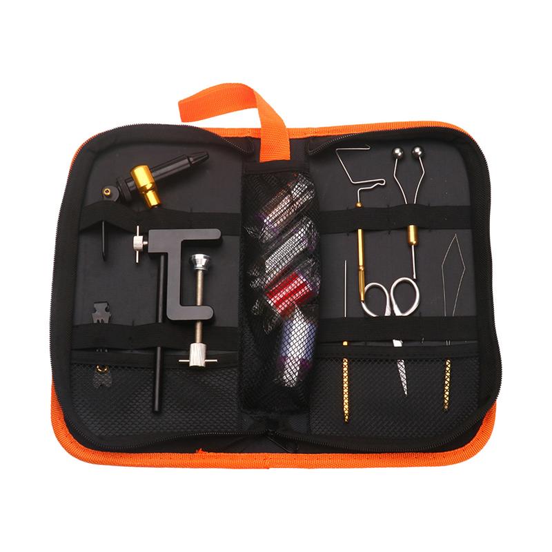 • Alicate para atar ganchos, Carrete de latón, Aguja de recogida, Enhebrador, Herramienta para atar nudos, Tijera, Cortador de líneas líderes, Líneas de atado de moscas, Bolsa de almacenamiento