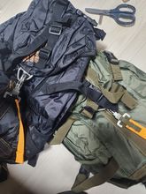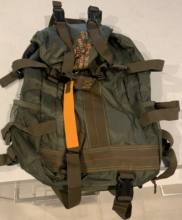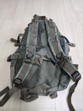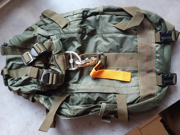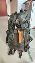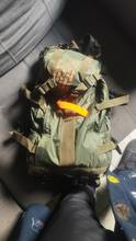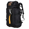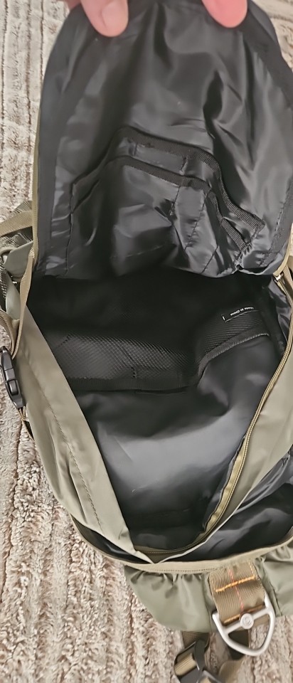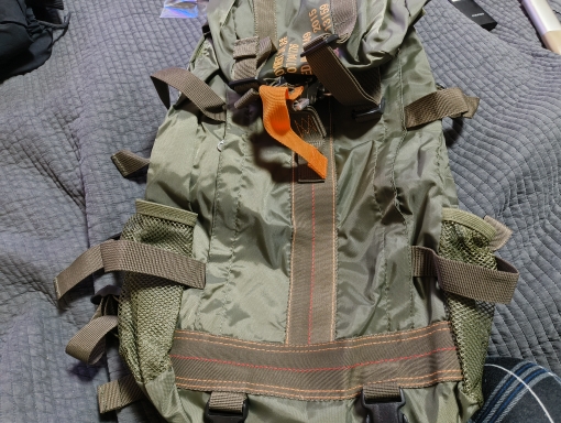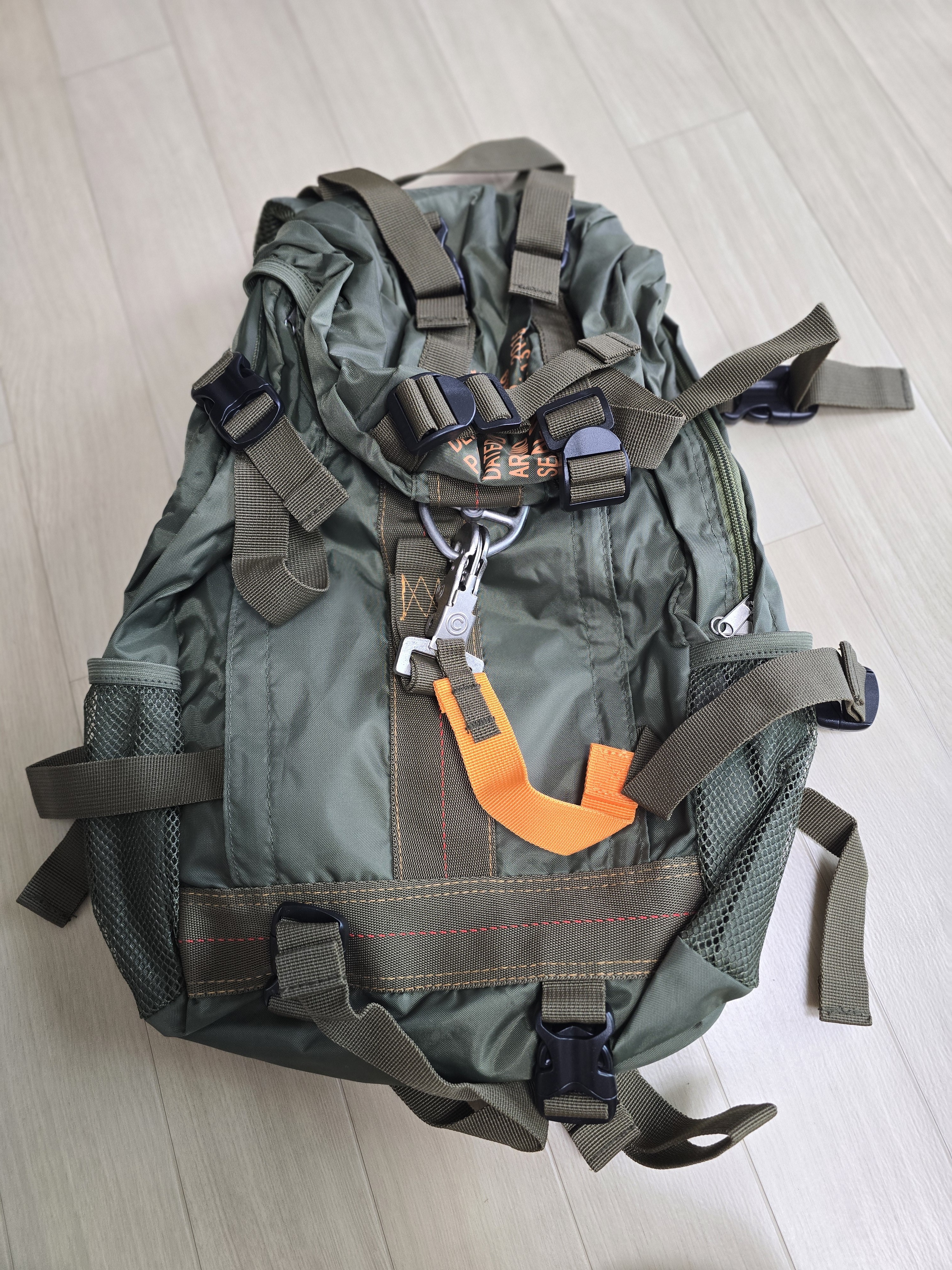 Cuenta con correas de compresión, gancho frontal distintivo, hebillas de estilo paracaídas y acceso rápido con pestaña naranja.